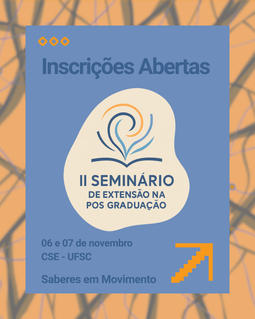 Nos dias 6 e 7 de novembro, o Centro Socioeconômico (CSE) da Universidade Federal de Santa Catarina (UFSC) sediará o II Seminário de Extensão na Pós-Graduação – Saberes em Movimento, promovido em parceria com a Universidade do Estado de Santa Catarina (UDESC), por meio do PROEXT-PG/CAPES.